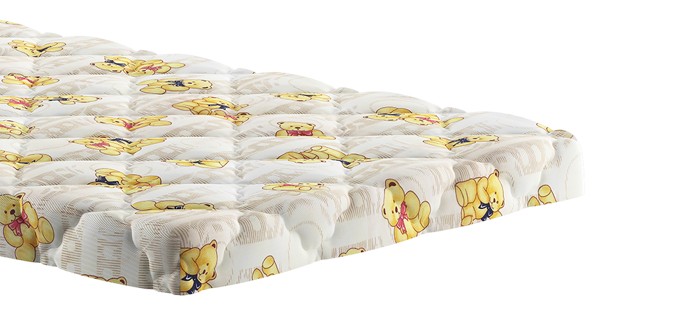 Верхнее покрытие матраса бязь с детским рисунком - хлопчатобумажная ткань полотняного переплетения. Особенность плетения заключается в том, что нити основы и утка имеют одинаковый размер и переплетаются равномерно. Ткань не имеет характерного блеска. Материал полностью натуральный. В целях достижения большей плотности, в волокна бязи добавляют синтетические нити. Однако доля синтетической примести не превышает 20%. Бязь широко используют при изготовлении верхнего покрытия детских матрасов.